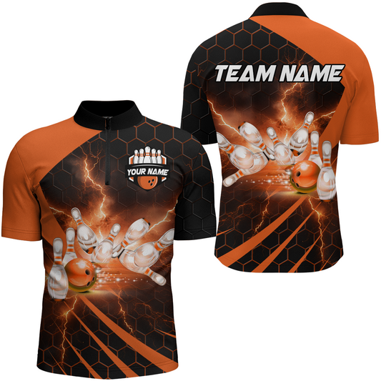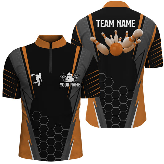 Black Men's Bowling Quarter Zip Shirt with Custom Name - Orange n6503