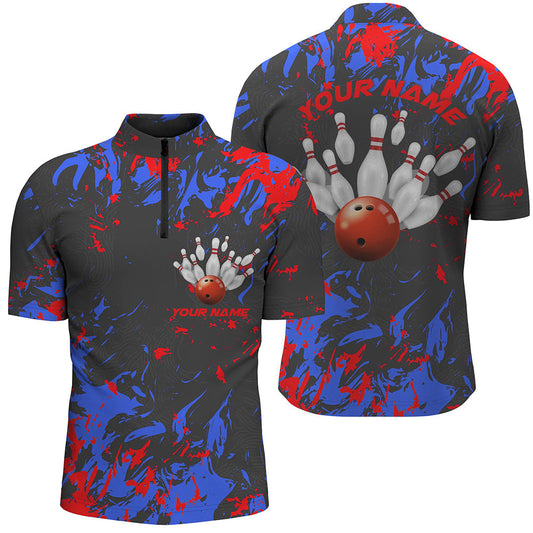 Men's Bowling Quarter Zip Shirt - Custom Red with Bowling Ball & Pins Design T144