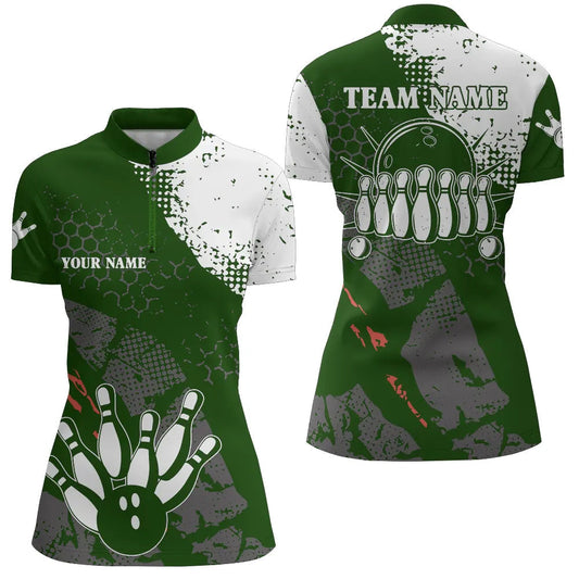 Women's Green Bowling Polo Jersey - Custom Fire League, Quarter Zip N7668