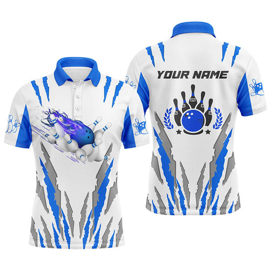 Men's White Bowling Polo Shirt with Custom Blue Flame Design N7166
