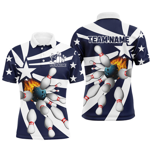 White Men's Bowling Polo Shirt - Custom Name with Flame Design and Bowling Ball & Pins N4901
