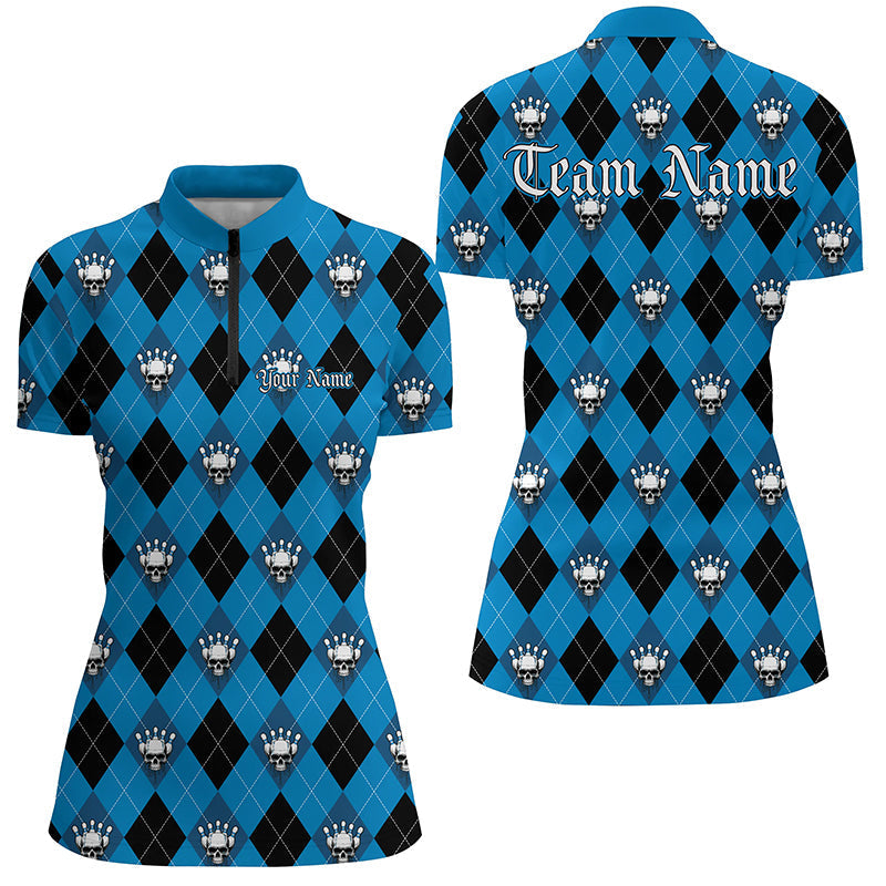 Black & Blue Argyle Skull Ladies Bowling Shirt - Halloween I7298
