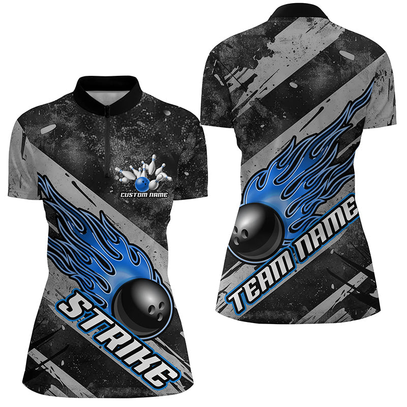 Women's Custom Bowling Team Shirts - Black & Blue Flame Jerseys I6479