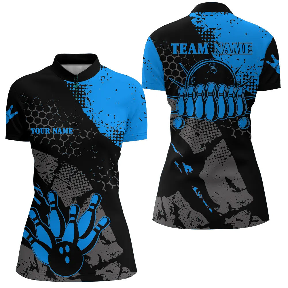 Women's Black & Blue Bowling Quarter Zip Shirt - Retro Ball Pins Design N6314