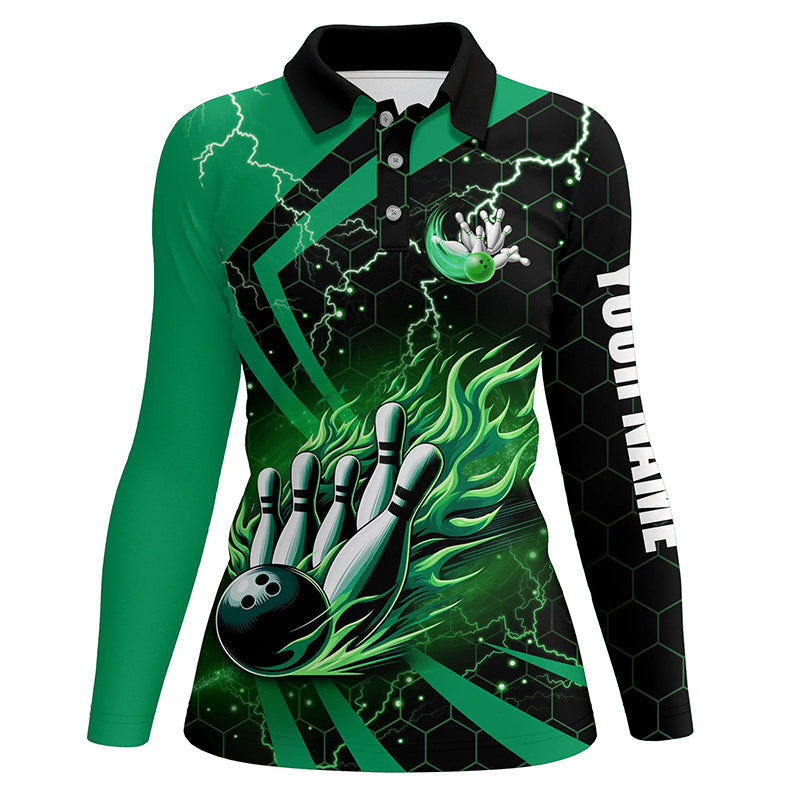 Women's Black & Green Flame Bowling Polo Shirt N7513