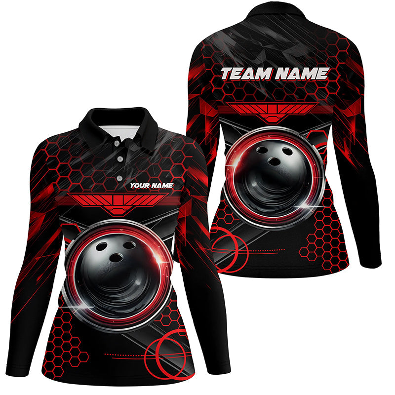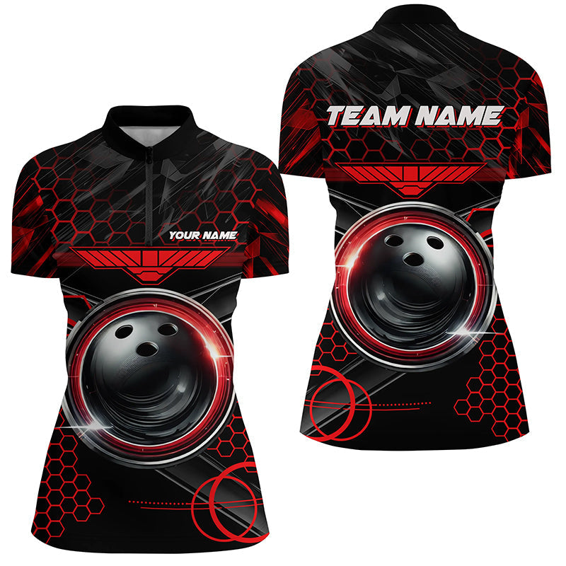 Women's Custom Bowling Shirts - Black & Red Hexagon Pattern N8327