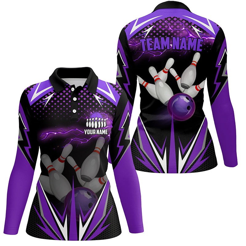Black Women's Bowling Polo Shirt - Custom Purple Lightning Team Jersey N6590