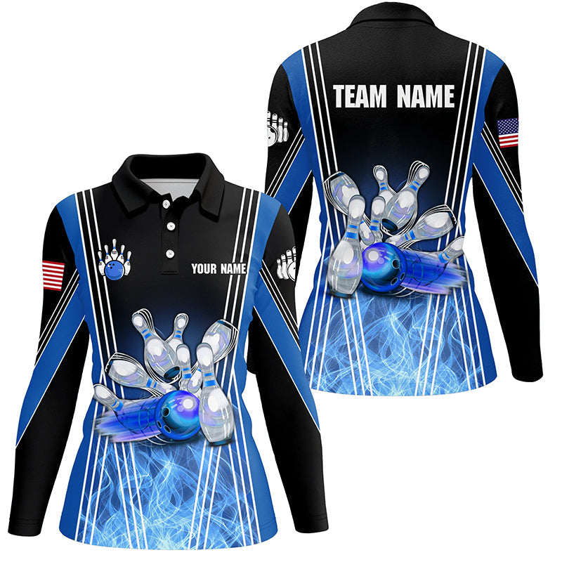 Women's Blue Flame Bowling Polo Shirt - Custom Team Jersey N7237