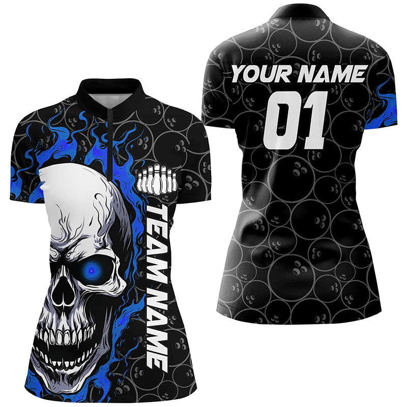 Custom Blue Flame Skull Halloween Ladies Bowling Shirt I7103