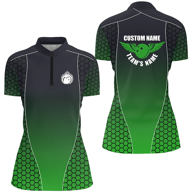 Women's Custom Bowling Team Shirts - Green Flaming Ball I4241