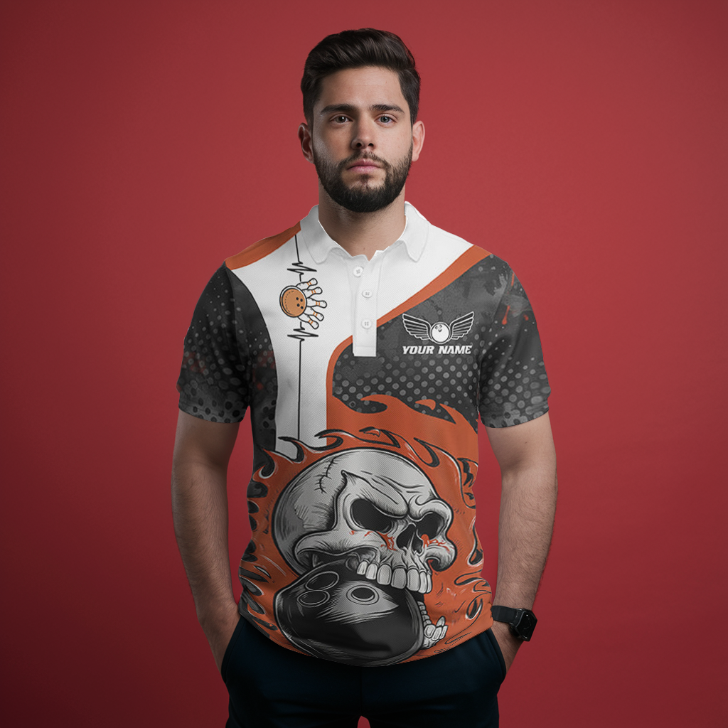Custom Orange Flame Skull Bowling Polo Shirt for Men I6757