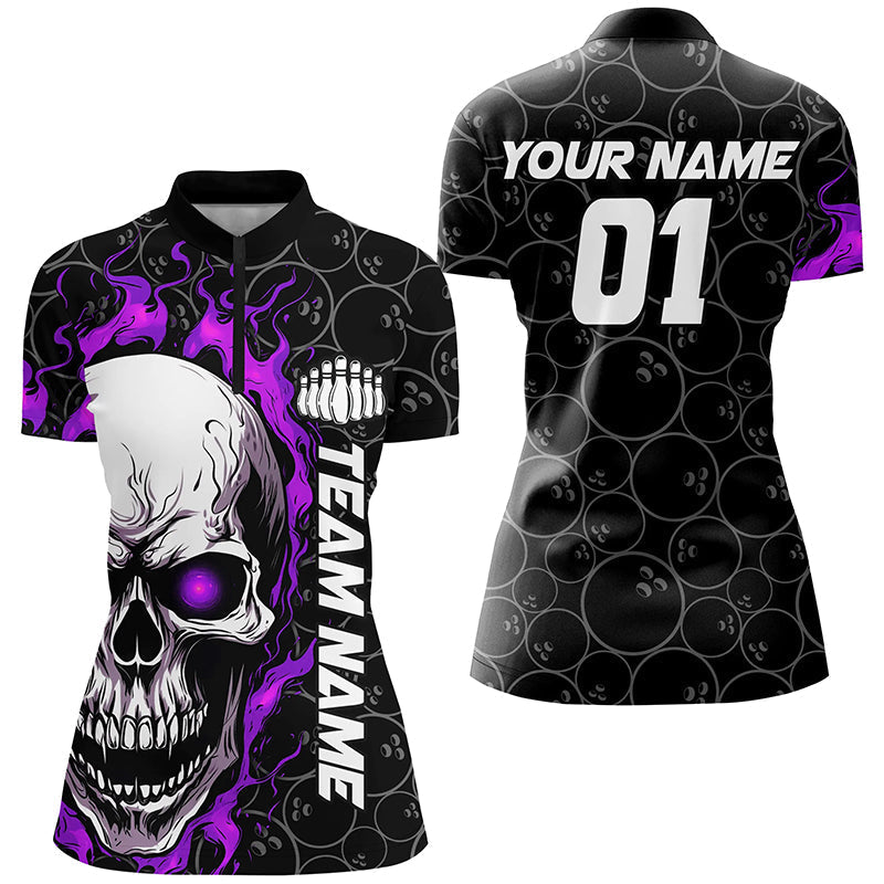 Custom Purple Flame Skull Halloween Ladies Bowling Shirt I7104