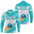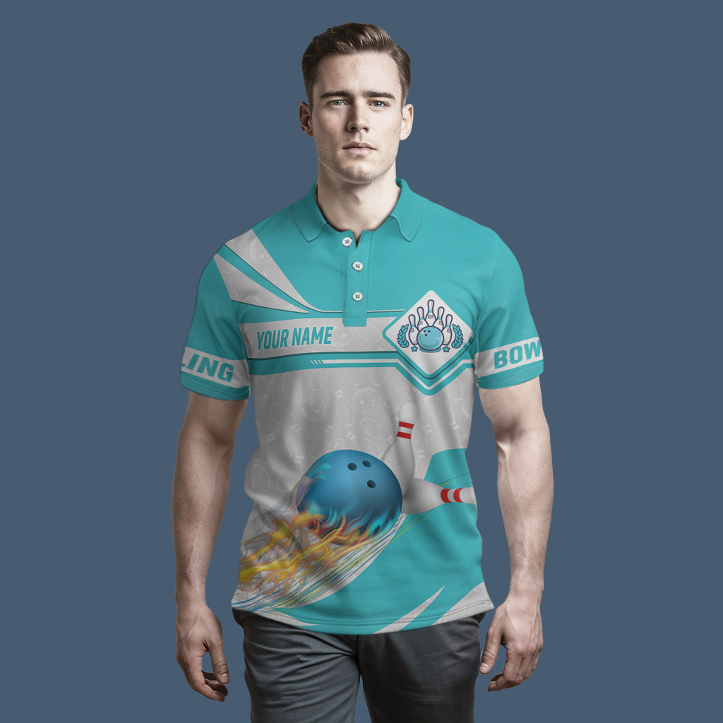 Cyan Blue Men's Bowling Polo Shirt - Custom Camo Flame Design N6733