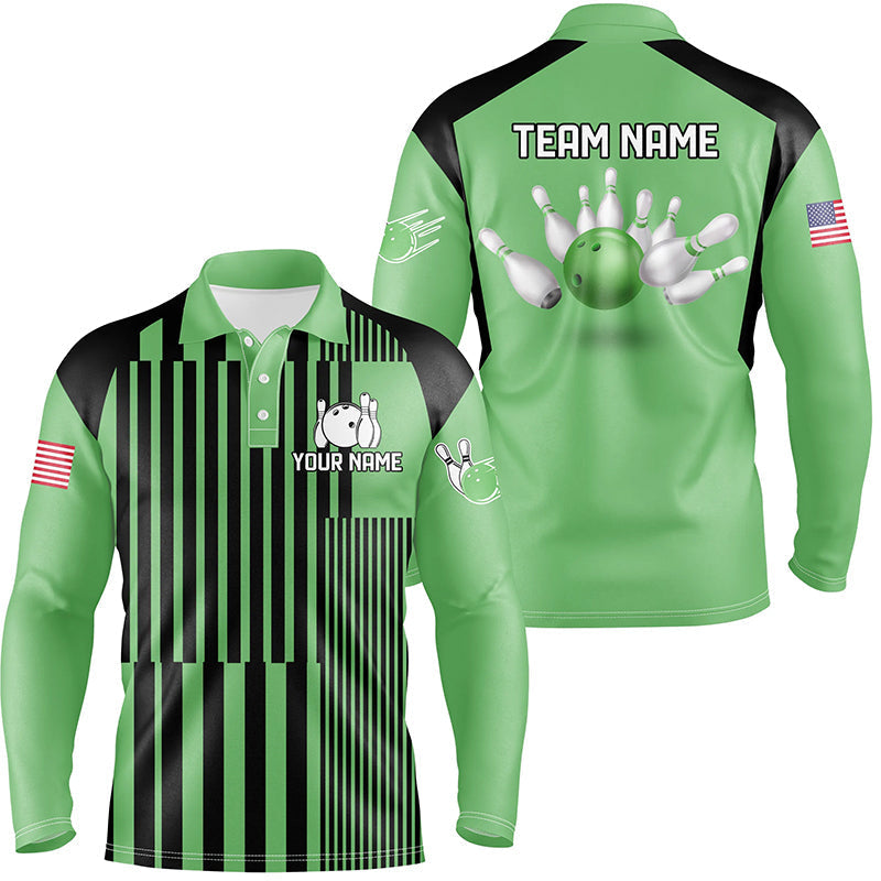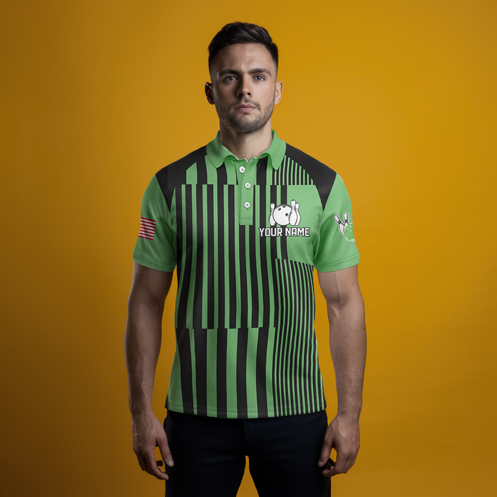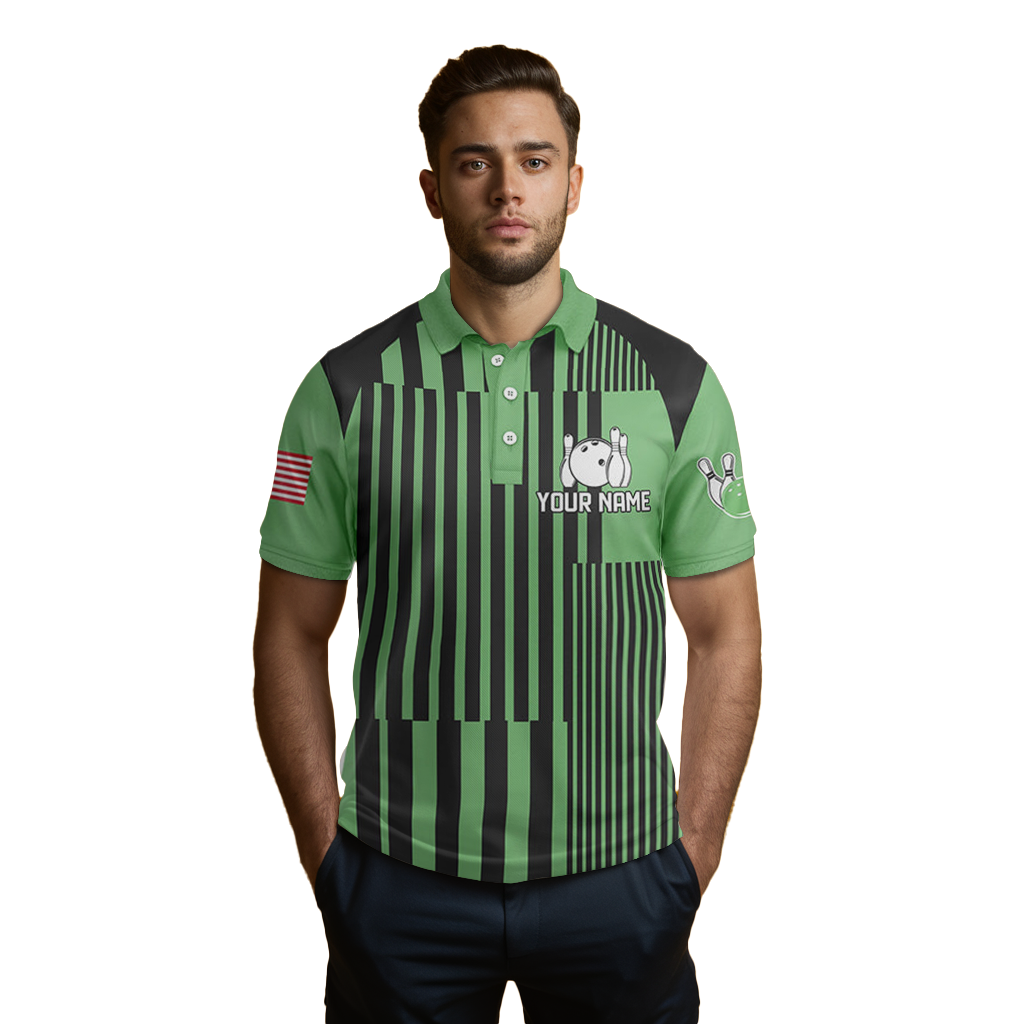 Green & Black Stripe Men's Bowling Polo Shirt - Custom Team Jersey N7349