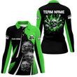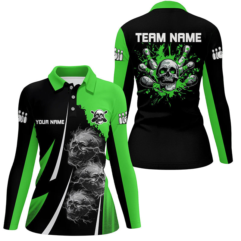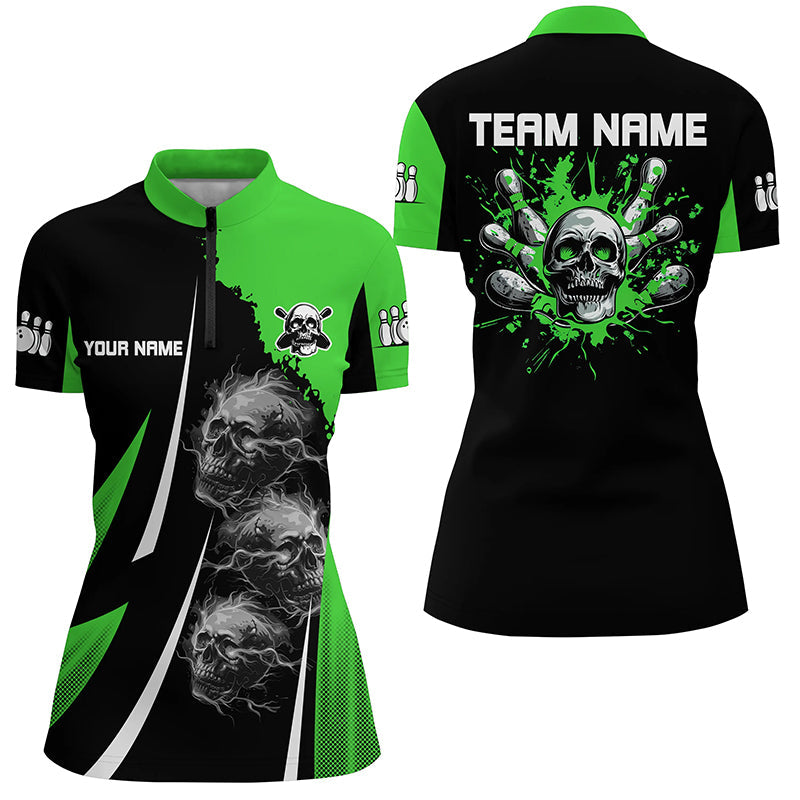 Green & Black Women's Bowling Polo, Quarter Zip, Custom Skull Design N7641