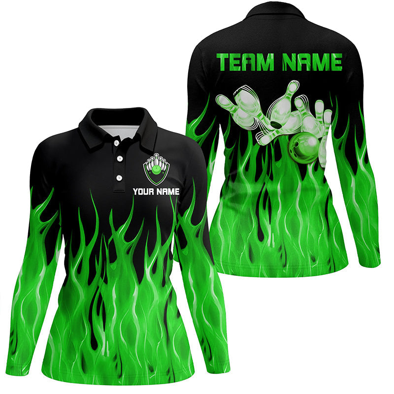 Green Flame Women's Bowling Polo Shirt - Black N7303