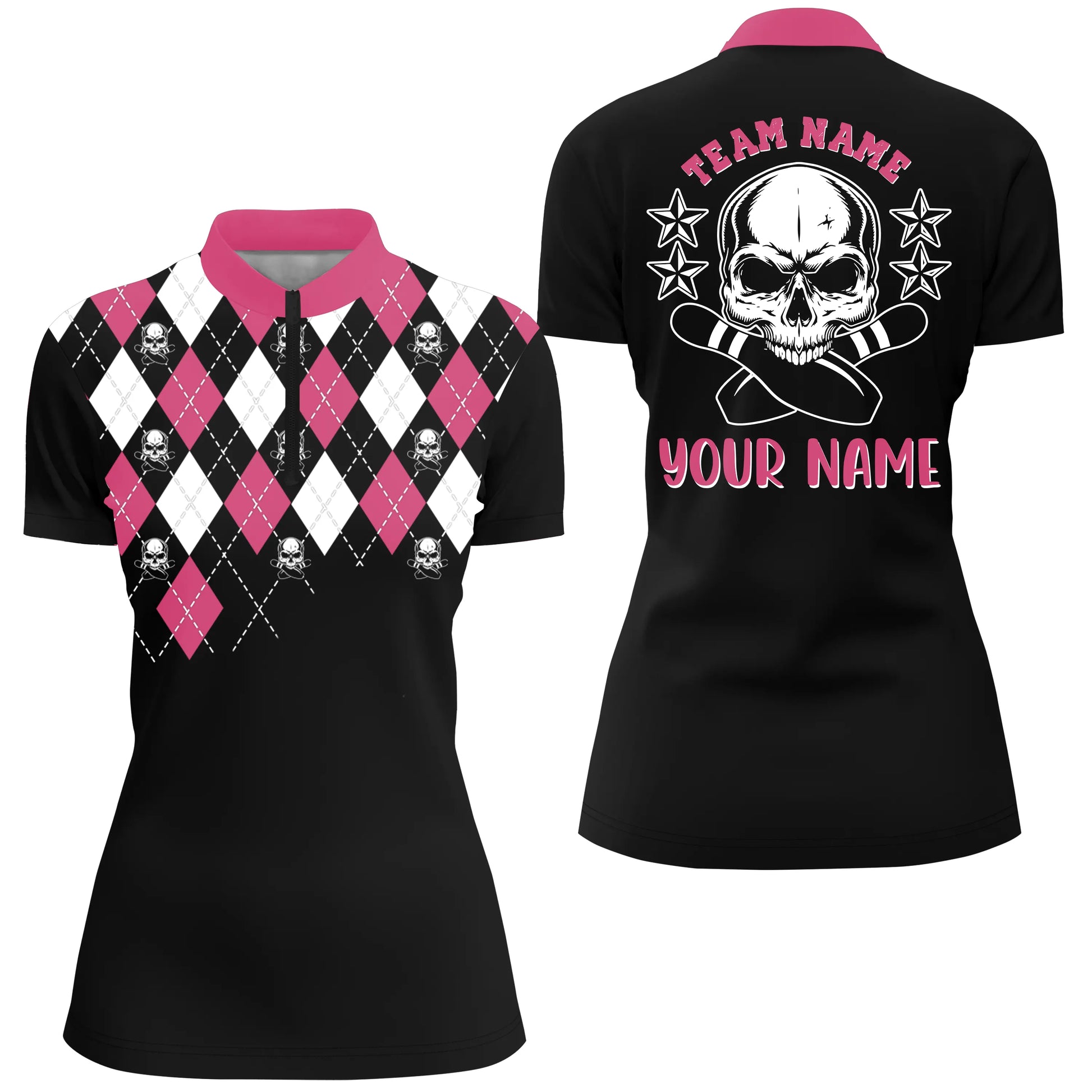 Pink Skull Custom Name Quarter Zip Bowling Shirt for Women N4690
