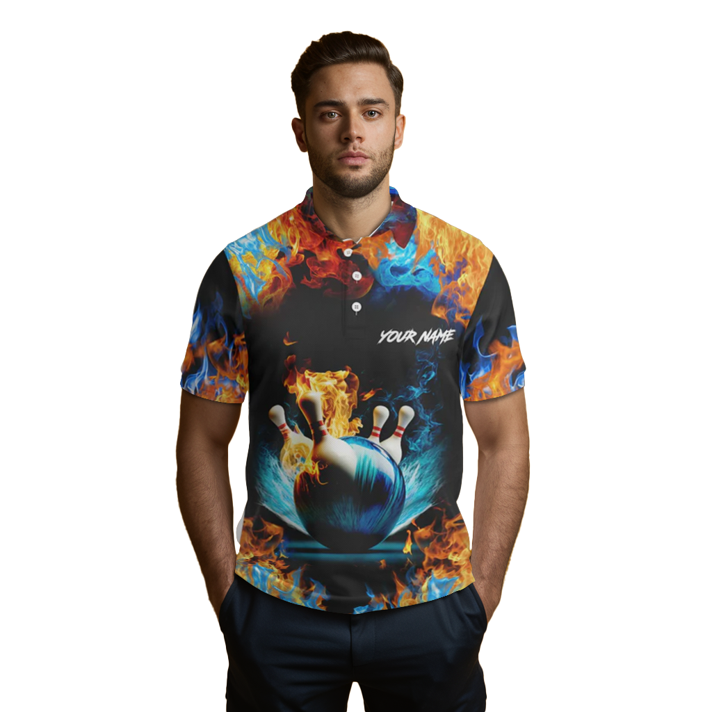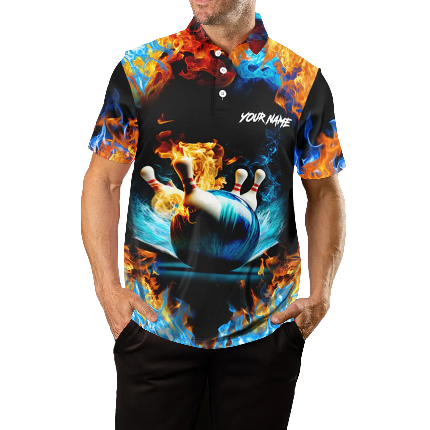 Custom Name Bowling Polo Shirt for Men - Water Fire Background N4705