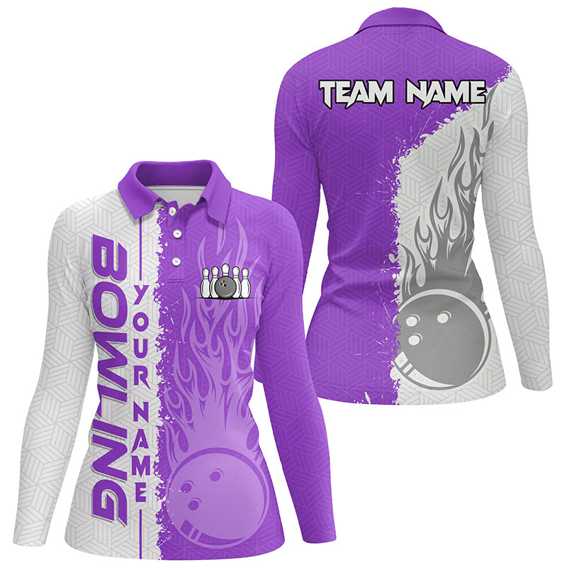 Women's Bowling Polo Shirt - Custom White & Purple Flame Design N7329